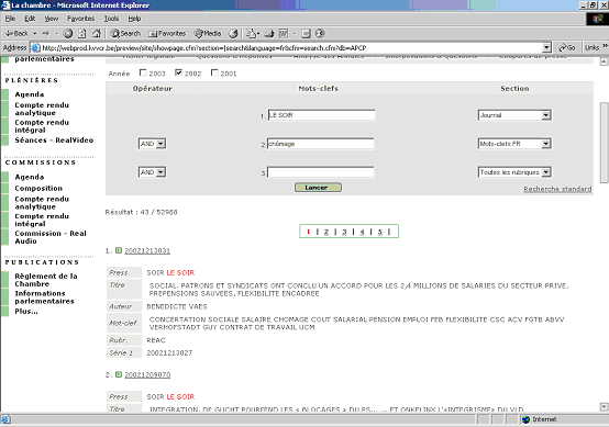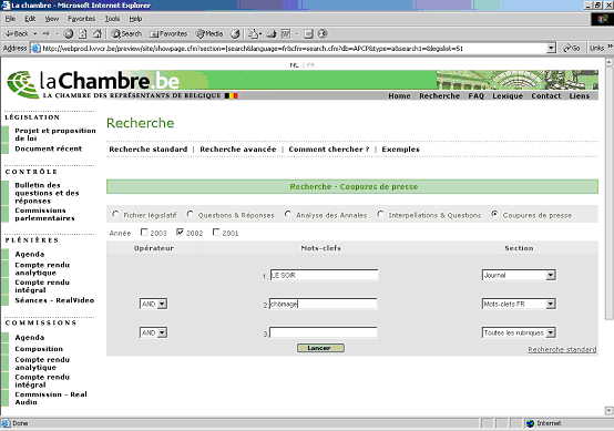 l'année 2002. Enfin, choisir les critères souhaités dans la colonne section, préciser leurs valeurs dans la colonne mots-clefs.