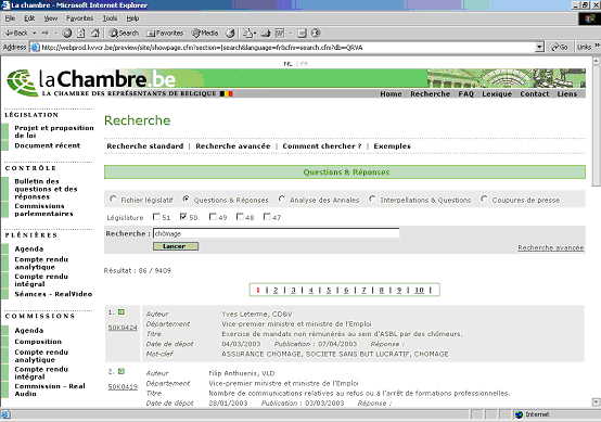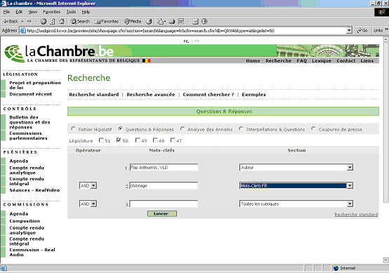 Sélectionner les options questions et réponses et législature 50; et ensuite, introduire