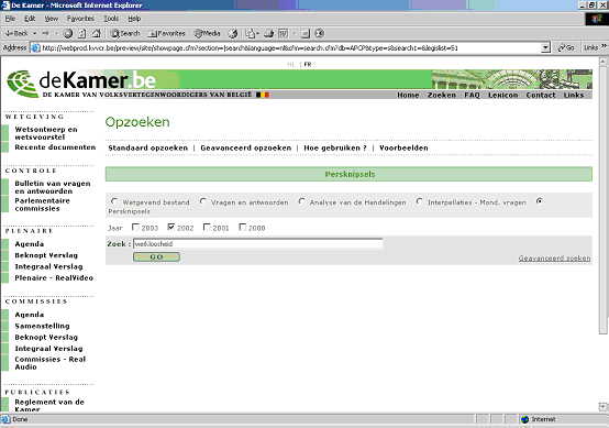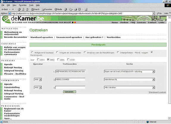 Selecteer Persknipsels en nadien het jaar 2002. Kies de gewenste criteria in de kolom Sectie, bepaal de prioriteit ervan in de kolom Trefwoorden, en specificeer