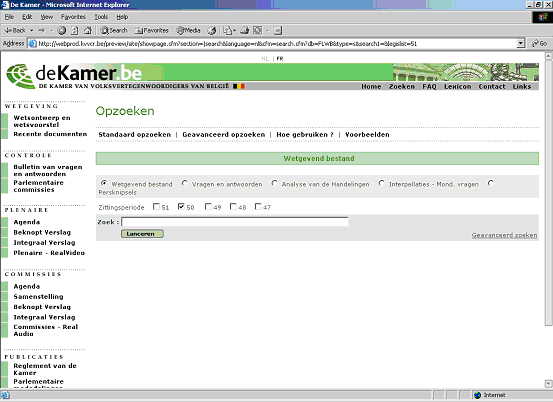Selecteer Wetgevend bestand en zittingsperiode 50. Kies de gewenste criteria in de kolom Sectie, bepaal de prioriteit ervan in de kolom Trefwoorden, en specificeer